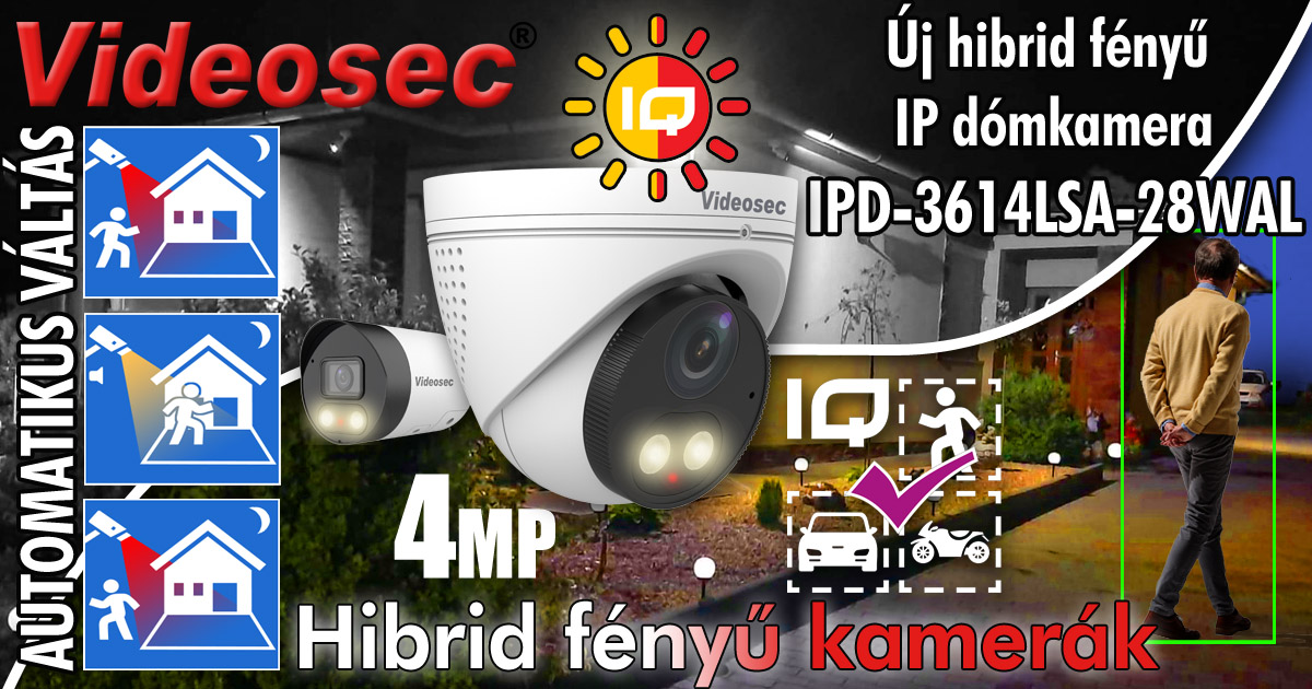 Éjszaka az infra világítás diszkréten rejti a kamerát, ellenben a kamerák fehér fényű LED-jei színes képet tesznek lehetővé, színinformációt biztosítanak. A Videosec IPD-3614LSA-28WAL hibrid fényű kamera automatikusan vált a két mód között, ha emberi jelenlétet vagy járművet észlel. Ahogy a két csőkamera párjánál, az IPW-2124LSA-28WAL/40WAL kameráknál, az IQ képanalitikája a riasztási eseményeket is emberi jelenléthez illetve járműhöz kapcsolódóan generálja.