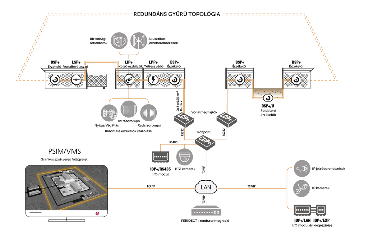 A Peridect+ rendszer egy kerítésre telepíthető, intelligens rezgés- és mozgásérzékelőkből álló hálózat, amely képes az olyan mechanikai behatolási kísérletek korai érzékelésére, mint a vágás, mászás, feszítés vagy rongálás. A fejlett jelfeldolgozó algoritmusok lehetővé teszik a környezeti hatások – például szél, csapadék vagy kisebb állatok mozgásainak – kiszűrését, „kihangolását”, ezáltal jelentősen csökkentve a téves riasztások lehetőségét. Az érzékelő hálózat zónákra osztható, így riasztás esetén pontosan meghatározható a behatolás helye, ami gyors és célzott intézkedést tesz lehetővé.