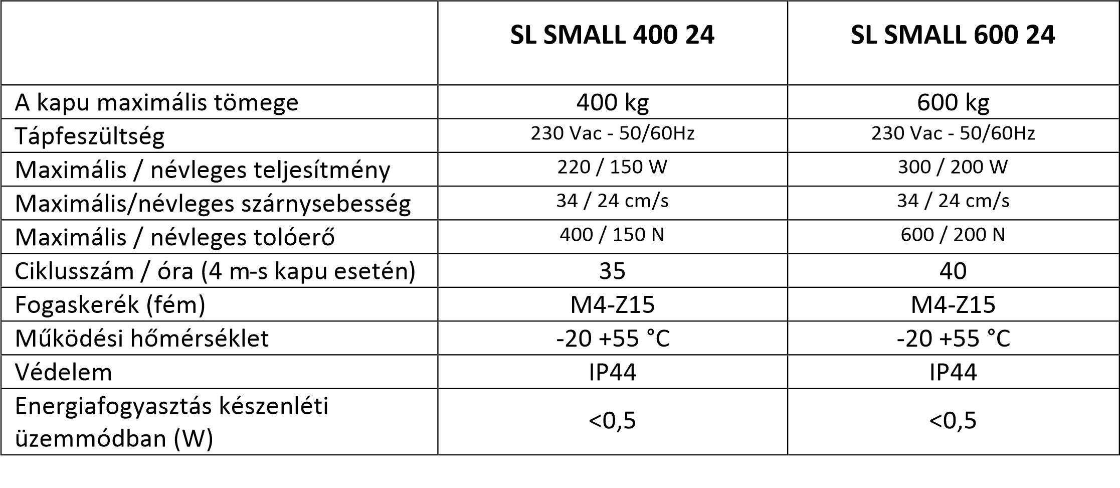 A tolókapuk automatizálása során alkalmazott elektromechanikus hajtások komplex rendszert alkotnak, ahol a mechanikai, villamos és vezérléstechnikai elemek szoros együttműködése biztosítja a megbízható működést. Az ABLE SL SMALL típusú, önzáró hajtóművek jól reprezentálják a kis- és közepes terhelésű kapurendszerek esetében alkalmazott műszaki megoldásokat. 24 V-s és 230 V-s változatban készülnek, 400 – 800 kg-s tömegű kapuk mozgatására.